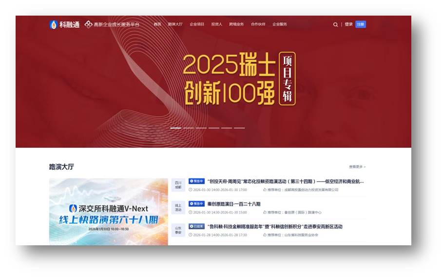 以明科技(Insight Tech)与深交所科融通(V-next)合作共建瑞士创新企业专属对华融资通道,精准对接深交所上市公司及大湾区核心投资机构资源,为有融资需求的瑞士科技企业提供高效展示窗口,推动跨境投融资落地与深度产业协同。2026年1月,该通道首批30个优质瑞士科技项目上线,项目库全年更新。