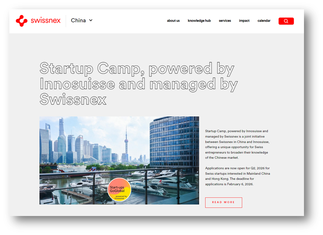 The “Startup Camp” is an official program powered by Innosuisse and managed by Swissnex. It opens to all Innosuisse-backed Swiss startups to validate and accelerate their exploration of the Chinese market.