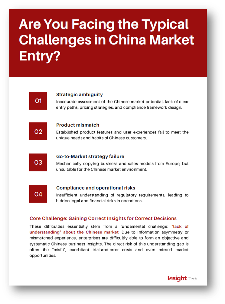 以明科技(InsightTech)提供“导航中国”战略认知咨询服务,专注于为瑞士创新提供进入中国市场所必需的核心商业理解与战略规划能力。凭借对瑞士创新生态的深刻理解和对中国产业现实的精准把握,帮助优质的瑞士成长期企业跨越认知鸿沟,制定出清晰、可行、风险可控的中国市场进入战略。